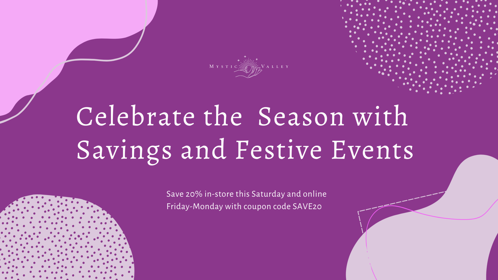 Embrace the magic of savings this holiday season with Mystic Valley. As the leaves turn and the air grows crisp, we're thrilled to share a special token of our gratitude. This weekend, immerse yourself in our mystical world and enjoy 20% off.