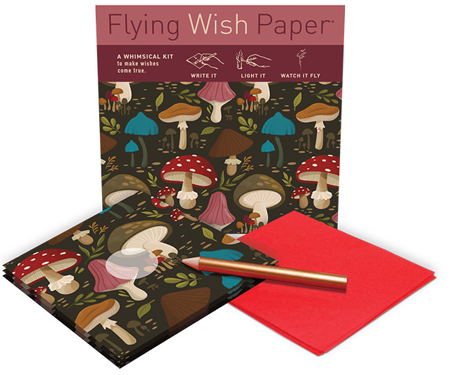 Do you have a wish or intention? Make it come true with Mushroom Flying Wish Paper. Think of a special wish and write it on the paper. Focus on your intention while you crumble the paper and then unwrap it. Shape your paper into a tube and place it on the wish platform. Light the top edge of the tube and watch it burn down in a beautiful flame. At the last moment, your wish magically lifts off the platform and rises into the air!